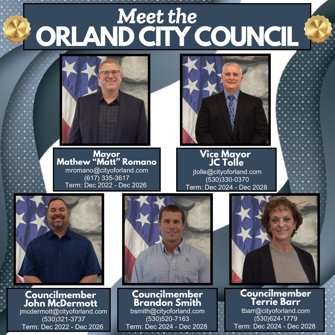 The Council meets twice a month for their regular meetings on the first and third Tuesdays. Their meetings will either be held at Carnegie Center , 912 3rd Street, Orland or Glenn Success Square in the conference center, 131 E Walker Street, (Please check agenda before arriving to meeting for location) Orland starting at 6:30 P.M. Agendas and minutes can be found on the Minutes and Agendas page. There is a time for public comment on every agenda but forms about City services and facilities are welcomed by the City Manager at City Hall, 815 Fourth Street, Orland; (530) 865-1603 at any time. The City Manager promptly investigates and equitably resolves complaints. Council member’s emails and phone numbers are listed below. If you wish to send a message to all Council members, contact Jennifer Schmitke, City Clerk. Additionally the governance policy is linked here.