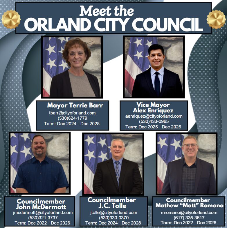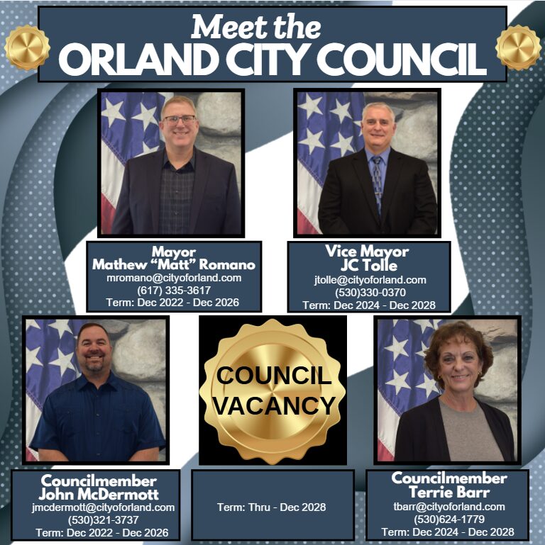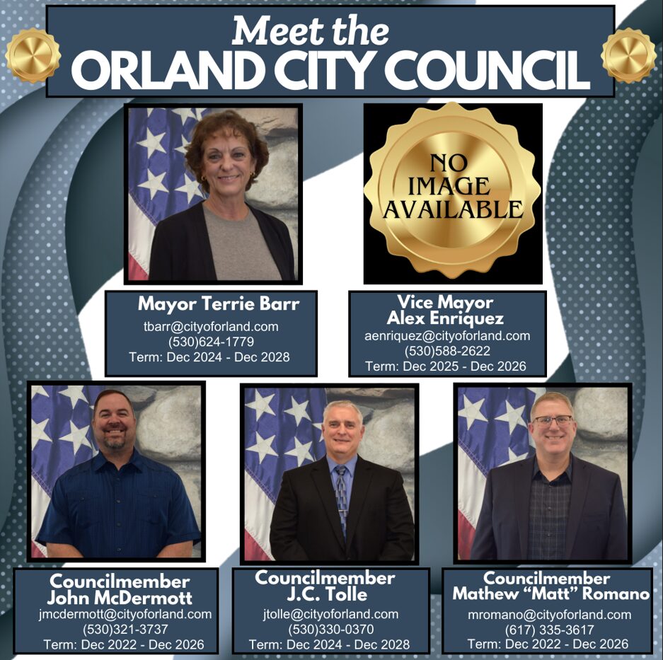 The Council meets twice a month for their regular meetings on the first and third Tuesdays. Their meetings will either be held at Carnegie Center , 912 3rd Street, Orland or Glenn Success Square in the conference center, 131 E Walker Street, (Please check agenda before arriving to meeting for location) Orland starting at 6:30 P.M. Agendas and minutes can be found on the Minutes and Agendas page. There is a time for public comment on every agenda but forms about City services and facilities are welcomed by the City Manager at City Hall, 815 Fourth Street, Orland; (530) 865-1603 at any time. The City Manager promptly investigates and equitably resolves complaints. Council member’s emails and phone numbers are listed below. If you wish to send a message to all Council members, contact Jennifer Schmitke, City Clerk. Additionally the governance policy is linked here.