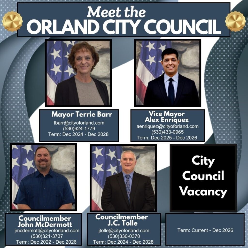 The Council meets twice a month for their regular meetings on the first and third Tuesdays. Their meetings will be held at Carnegie Center , 912 3rd Street, Orland Orland starting at 6:30 P.M. Agendas and minutes can be found on the Minutes and Agendas page. There is a time for public comment on every agenda but forms about City services and facilities are welcomed by the City Manager at City Hall, 815 Fourth Street, Orland; (530) 865-1603 at any time. The City Manager promptly investigates and equitably resolves complaints. Council member’s emails and phone numbers are listed below. If you wish to send a message to all Council members, contact Jennifer Schmitke, City Clerk. Additionally the governance policy is linked here.
