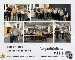 In order to register for the training contact Officer Ryan Martindale at 530-865-1616 or email rmartindale@cityoforland.com. The Orland VIPS is a dedicated group of citizen volunteers. Those interested in attending the next Citizen’s Academy must complete and return the attached application. To apply you must be 16 years of age, have no misdemeanor convictions within the last year of application and no felony convictions.